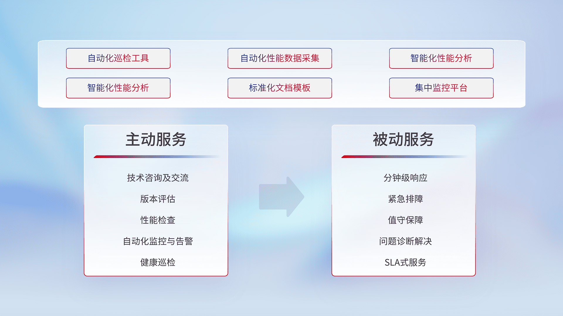 智能化工具和标准化文档,,,保障服务质量,,,提供主动服务(包含技术咨询、、版本评估、、、、性能检查、、、、自动化监控与告警、、、健康巡检)和被动服务包含(分钟级响应、、、紧急排障、、值守保障、、问题诊断解决、、SLA服务)。。