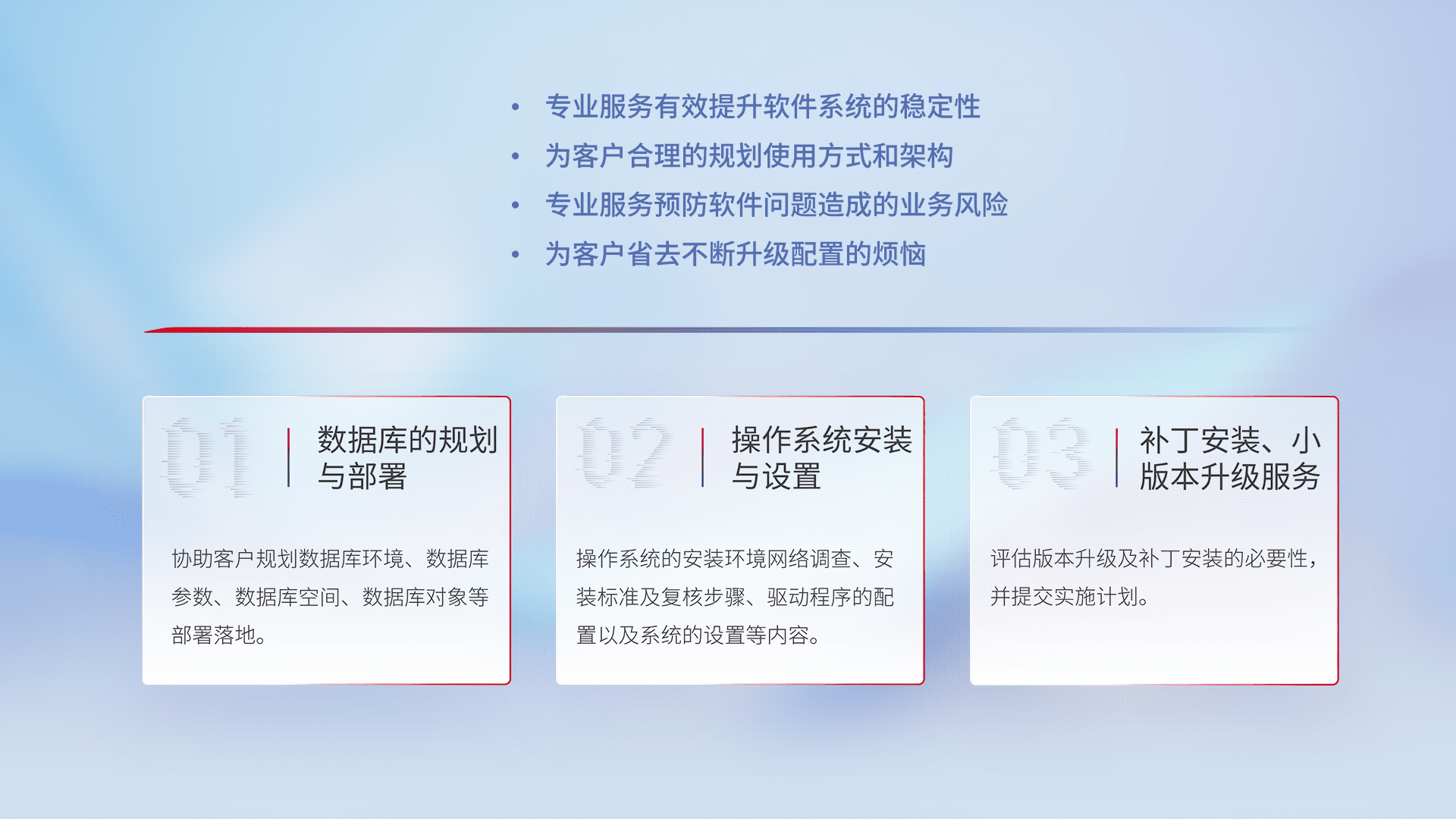 为客户提供软件规模升级、、、、快速部署、、、按需配置的专业服务,,,,从数据库的规划与部署到操作系统的安装与设置,,再到补丁安装和小版本升级提供支持。。